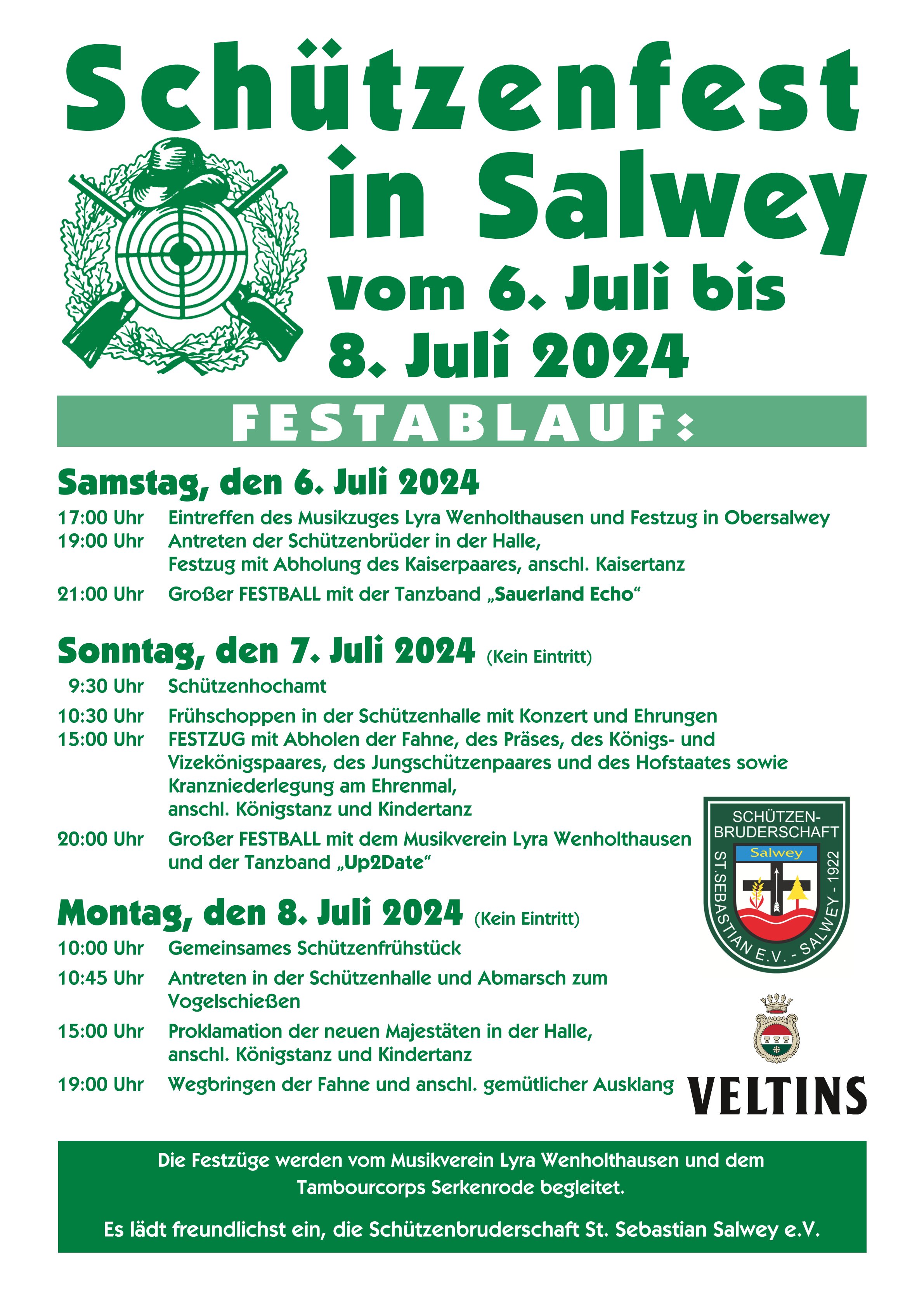 Das Programm wurde in Papierform bereits an die Schützenbrüder verteilt. Salwey Aktiv hat alles noch einmal zum Nachlesen zusammengefasst. Anbei finden Sie das Programm und die offiziellen Informationen zu den Ehrungen und dem Festablauf.