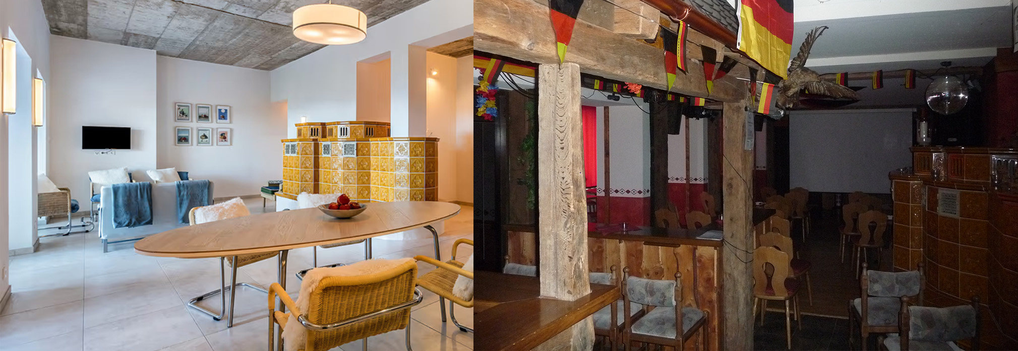 (Der Alte Kachelofen ist erhalten worden. Ein Wand trennt diesen Großen Raum nun, dort, wo damals die Tanzfläche mit Zugang zum Restaurant/Küche war)