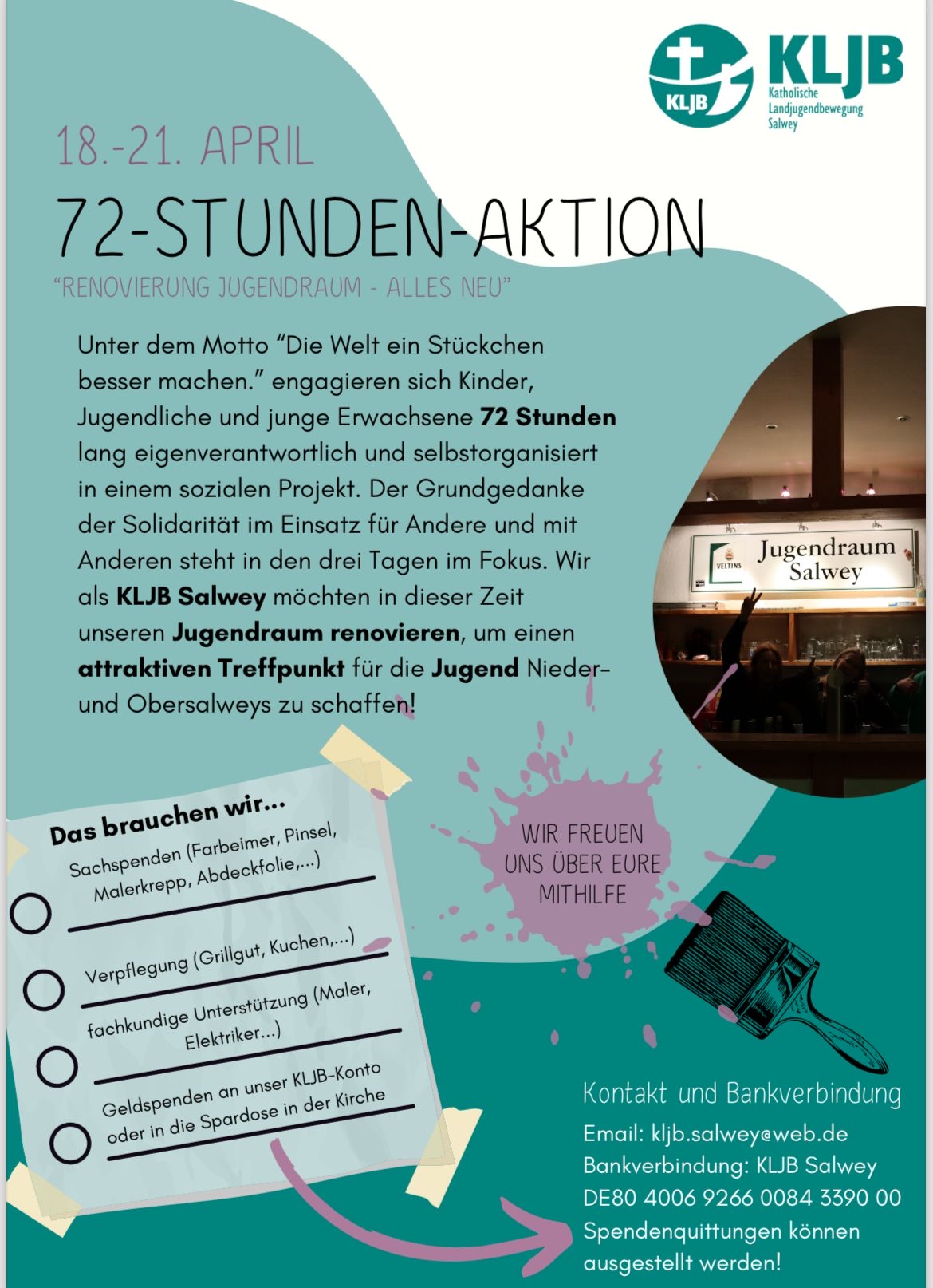 Unter dem Motto „Die Welt ein Stückchen besser machen“ engagieren sich Kinder, Jugendliche und junge Erwachsene 72 Stunden lang eigenverantwortlich und selbstorganisiert in einem sozialen Projekt. Der Grundgedanke der Solidarität im Einsatz für Andere und mit Anderen steht in den drei Tagen im Fokus. Wir als KLJB Salwey möchten in dieser Zeit unseren Jugendraum renovieren, um einen attraktiven Treffpunkt für die Jugend Nieder- und Obersalweys zu schaffen.