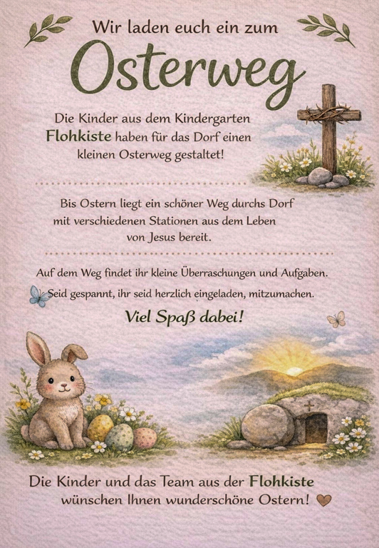 Ein herzliches Dankeschön gilt dem Kindergarten Flohkiste für die Initiative sowie allen Beteiligten, die mit ihrem Einsatz, ihrer Zeit und ihrer Kreativität diesen besonderen Weg möglich gemacht haben. Dieses Projekt zeigt eindrucksvoll, was entstehen kann, wenn eine Dorfgemeinschaft zusammenwirkt.